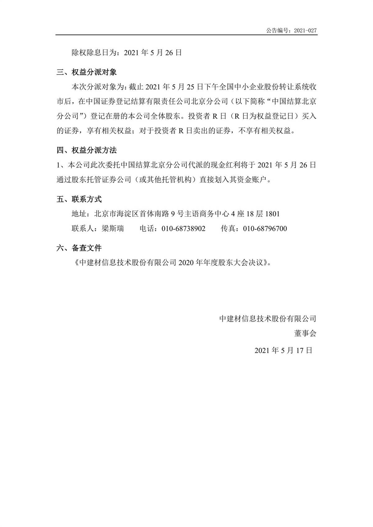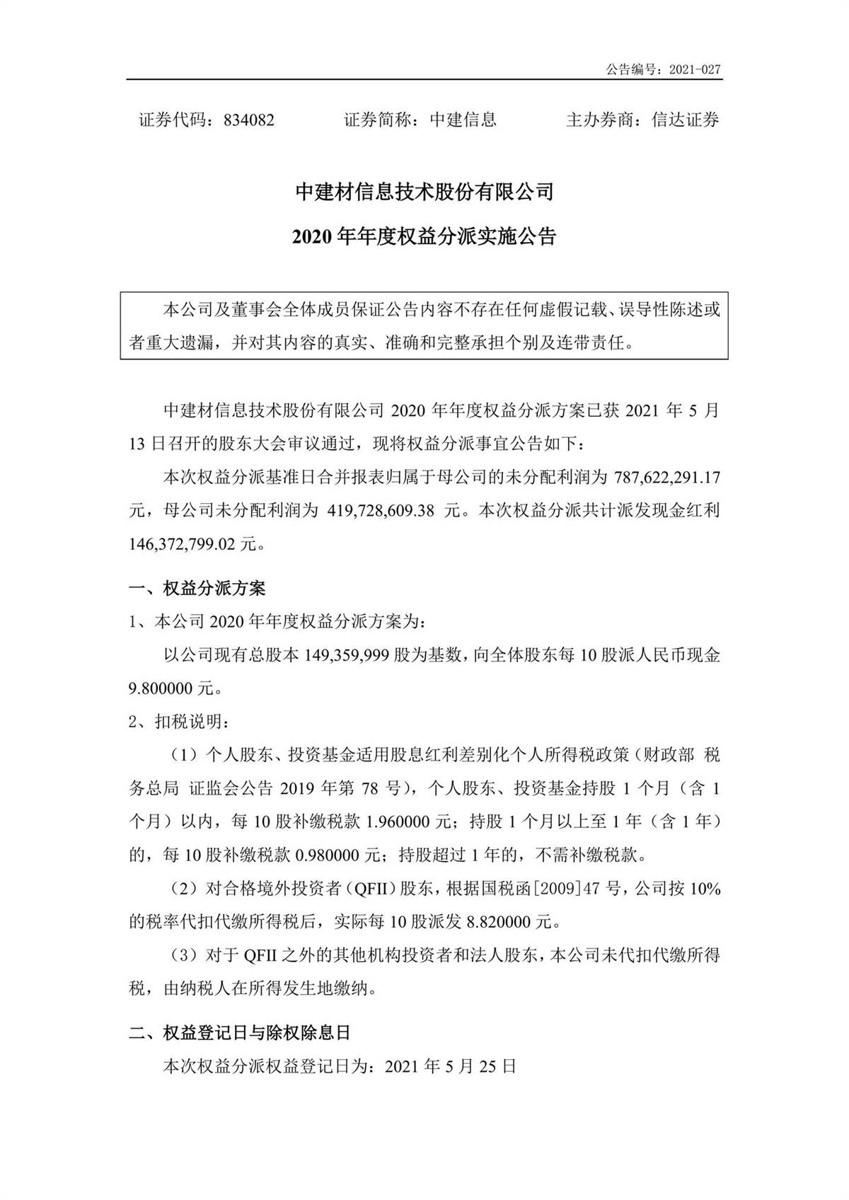 中建信息2020年年度權(quán)益分派實施公告