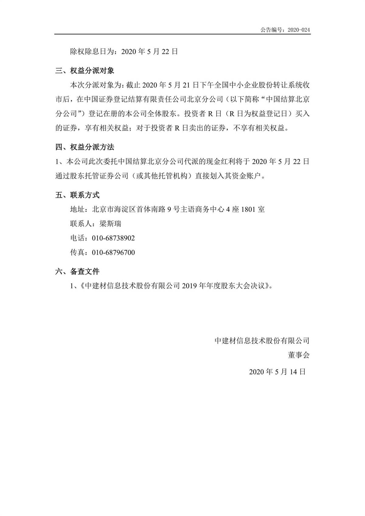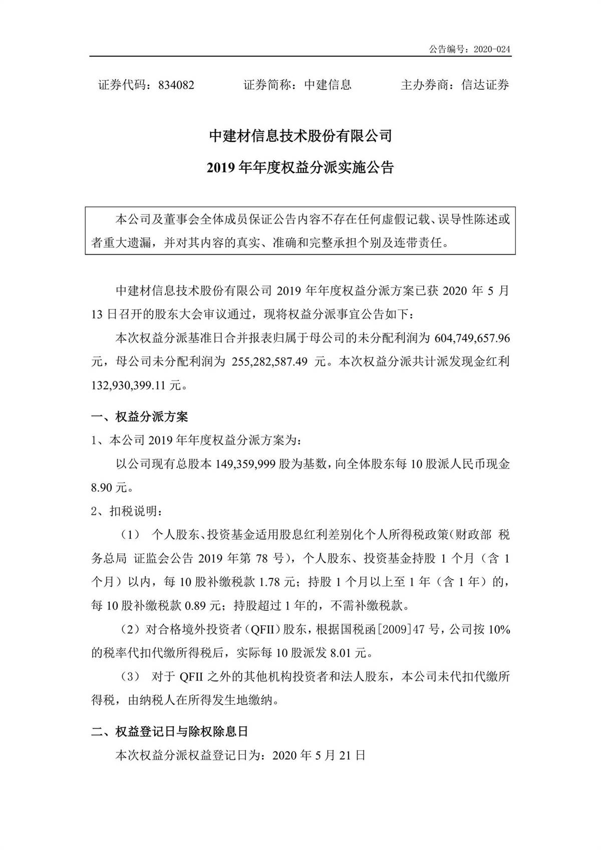 中建信息2019年年度權益分派實施公告