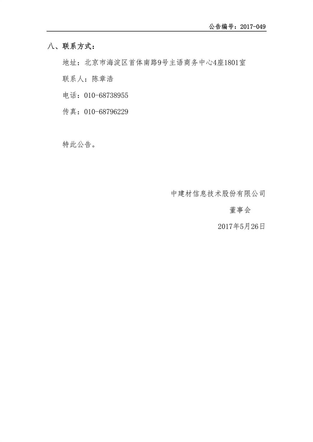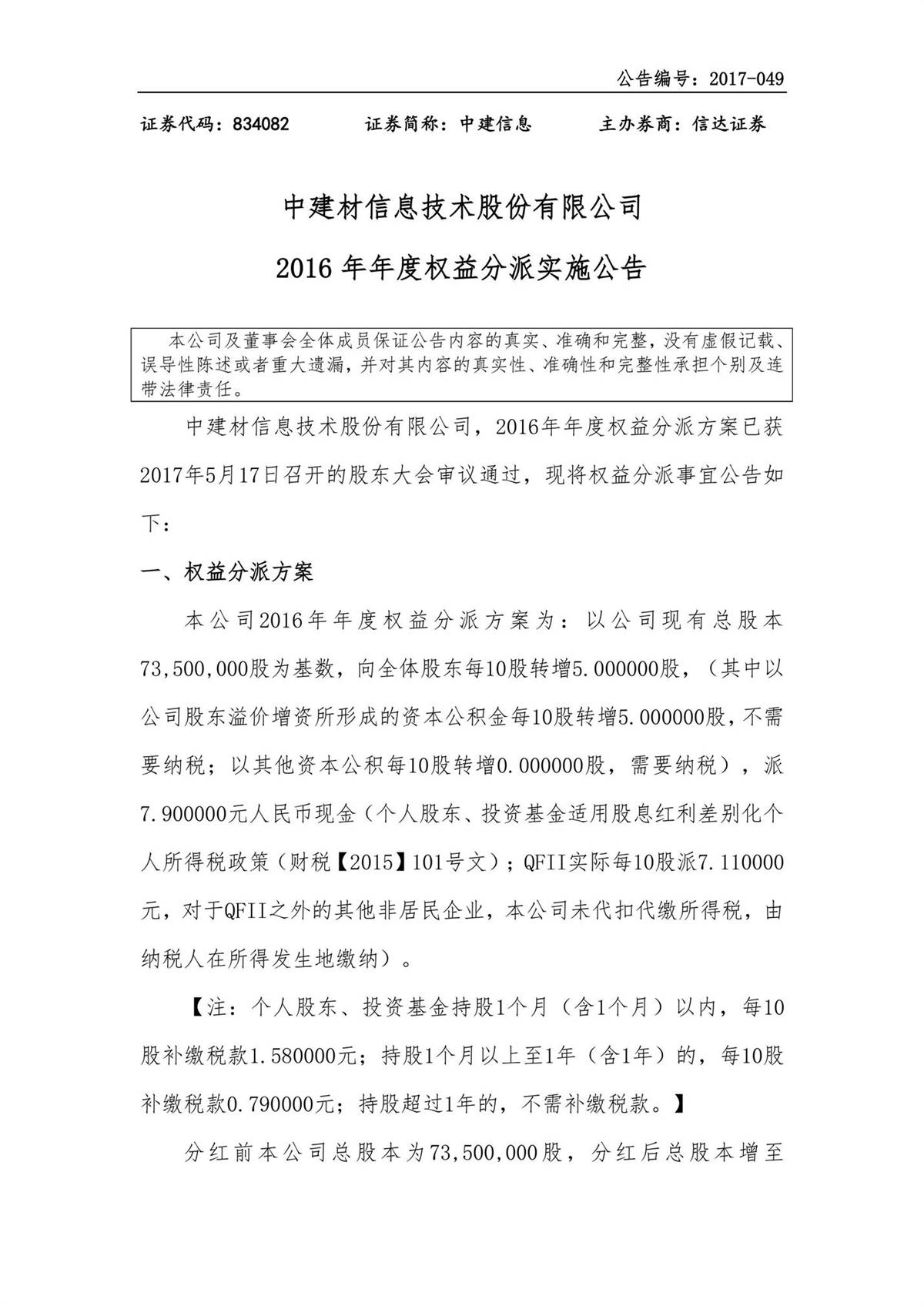 中建信息2016年年度權益分派實施公告