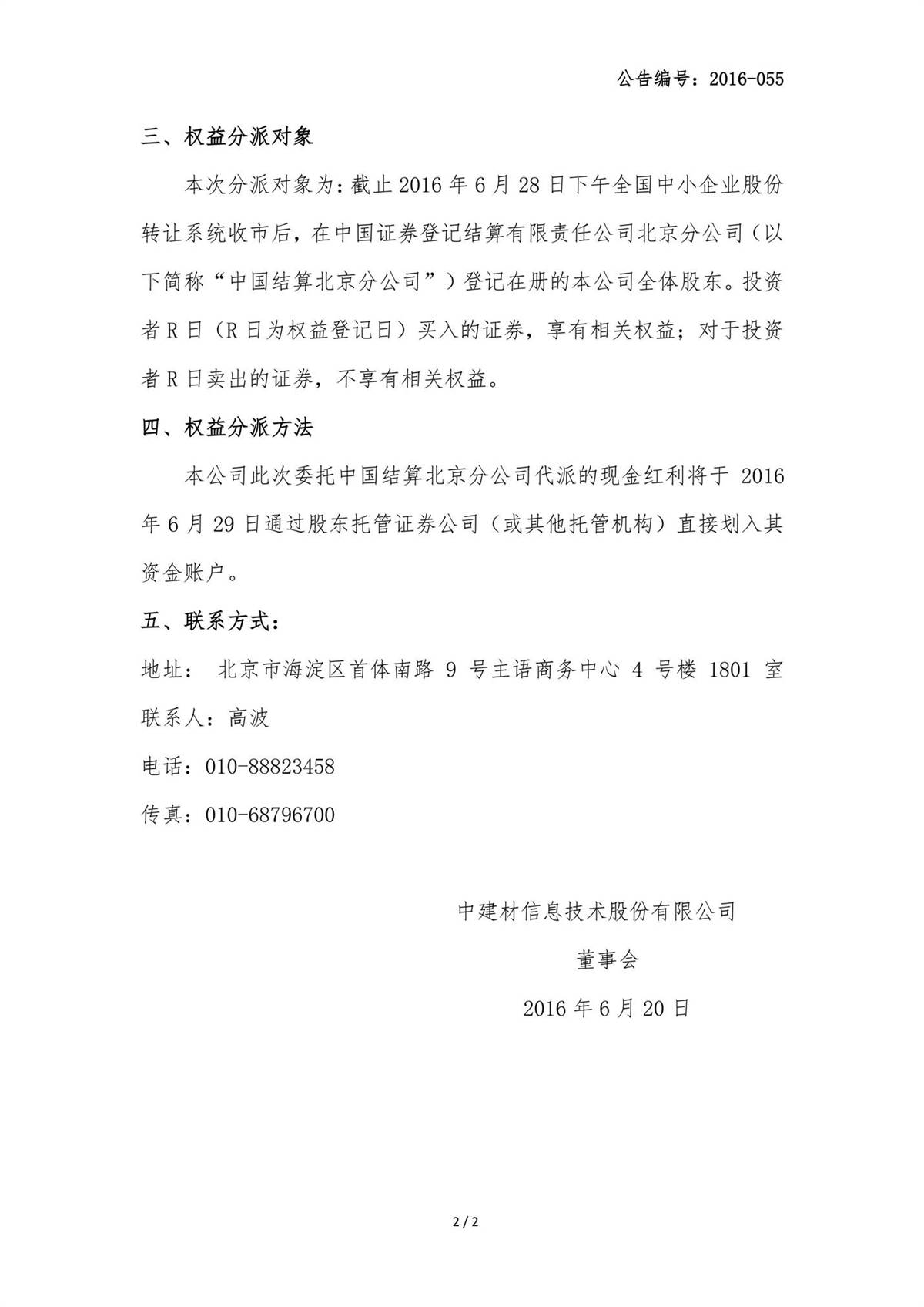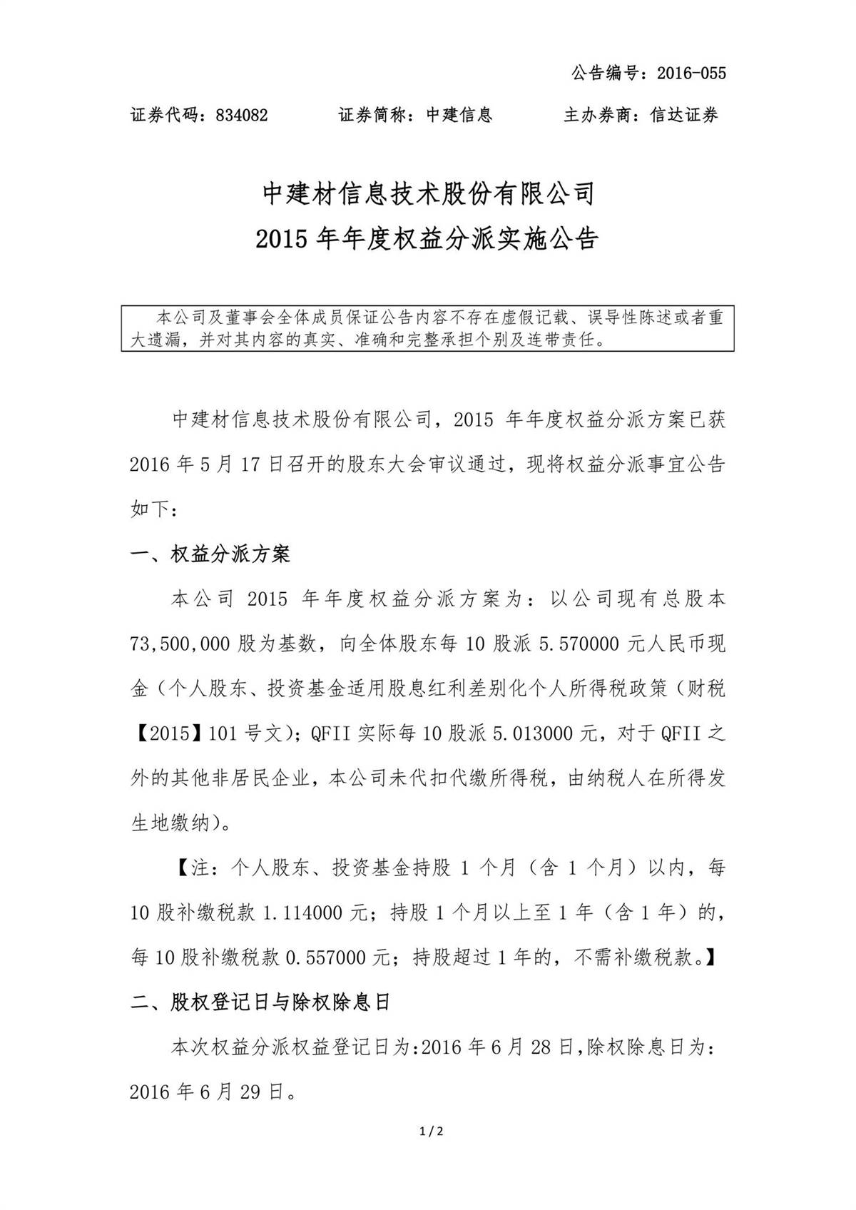 中建信息2015年年度權益分派實施公告